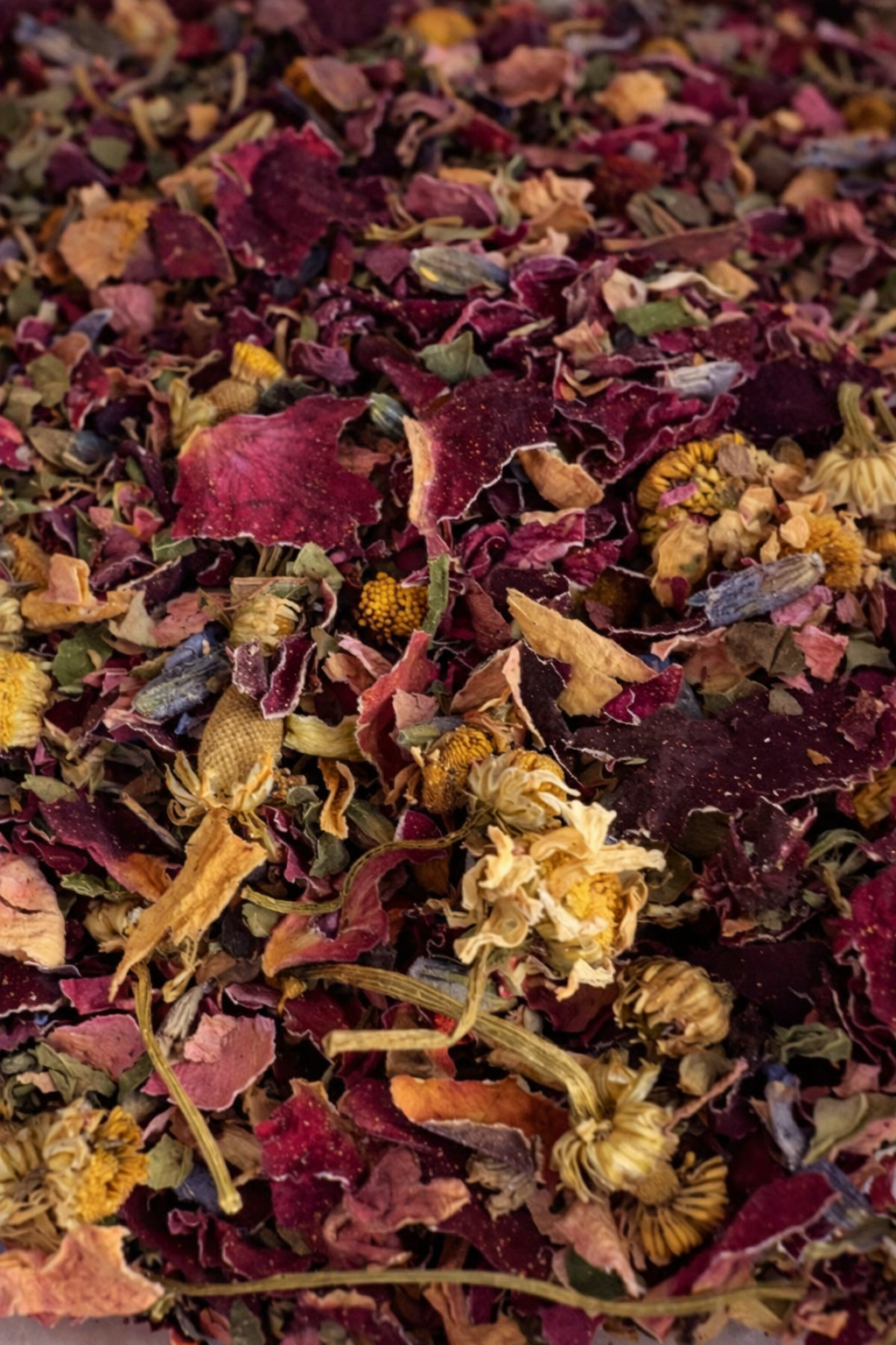 Rose petals, chamomile flowers, peony petals, lemon balm, lavender buds